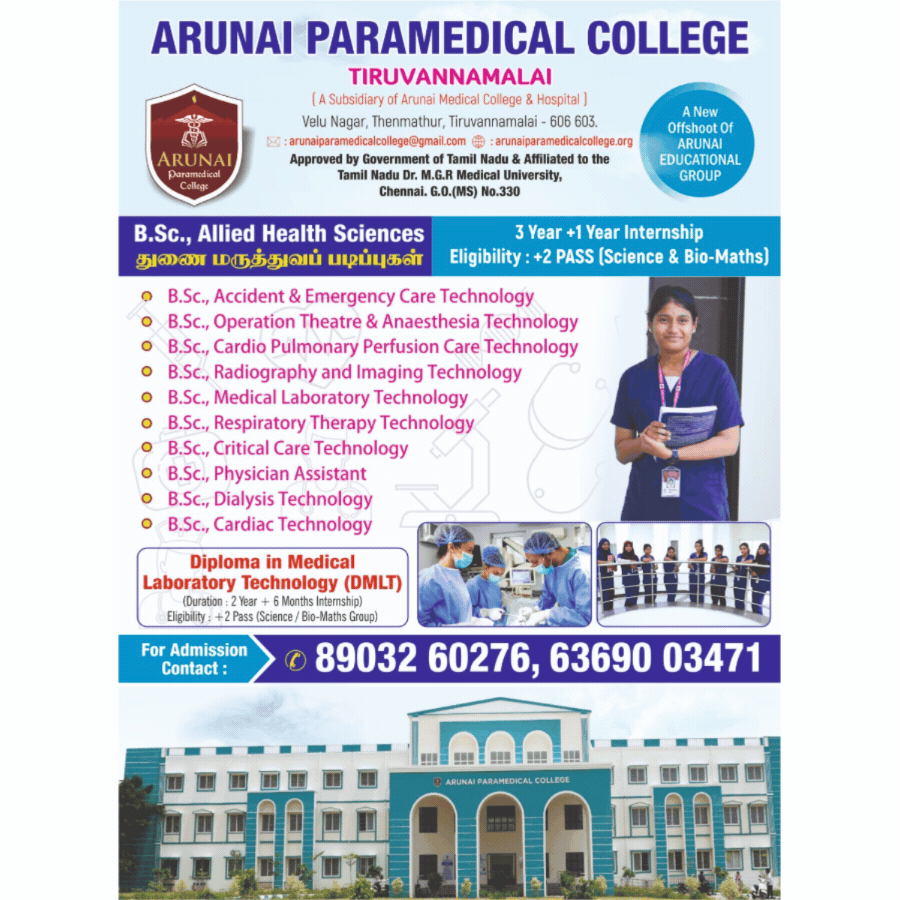Arunai Paramedical College is a premier institution under the esteemed Arunai Medical College & Hospital, dedicated to delivering excellence in allied health sciences. Located in Velu Nagar, Thenmathur, Tiruvannamalai, the college spans 3.5 acres along the prominent Cuddalore–Chittoor highway, making it easily accessible to students from the surrounding districts of Vellore, Arani, and Cuddalore.
